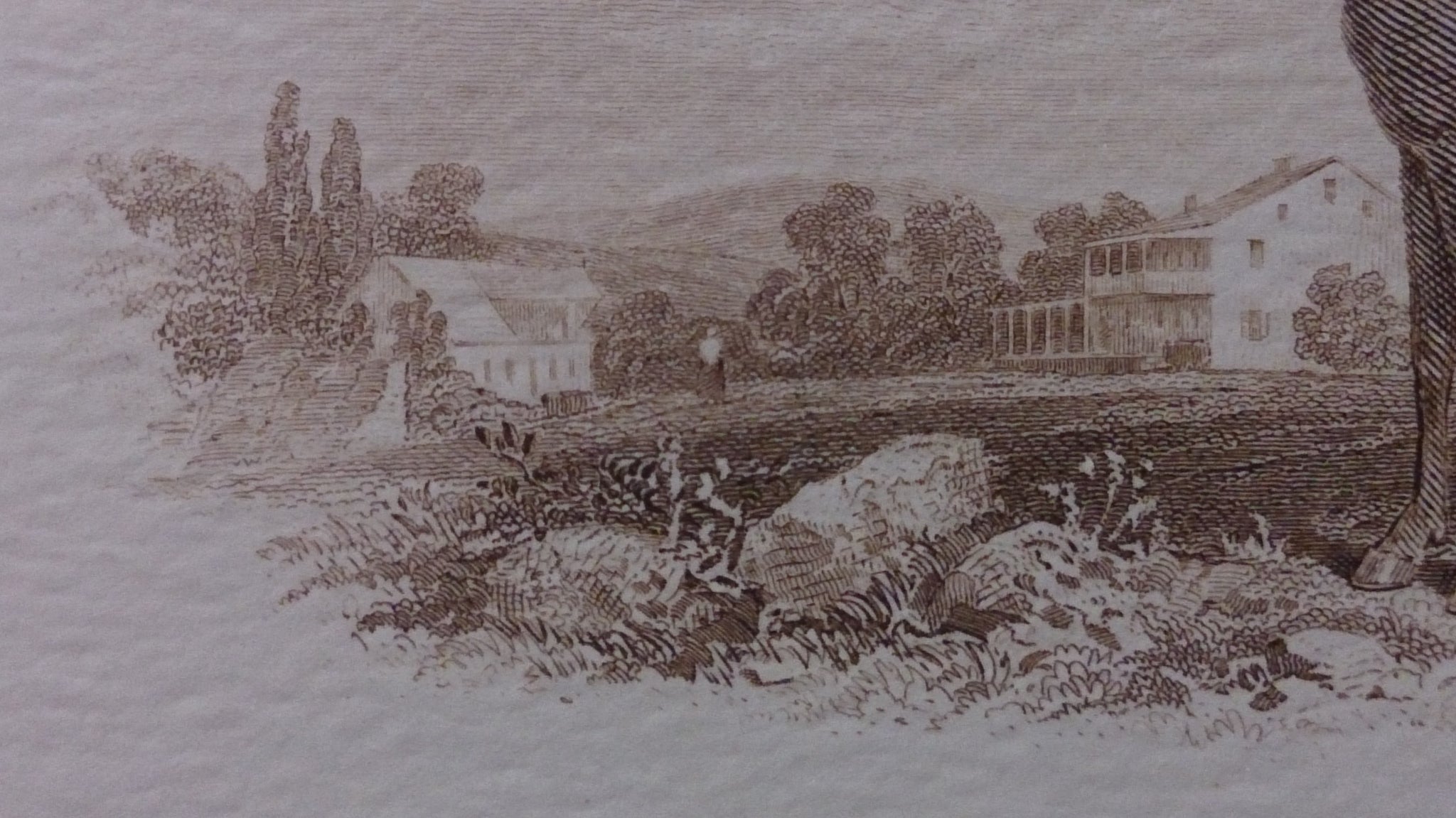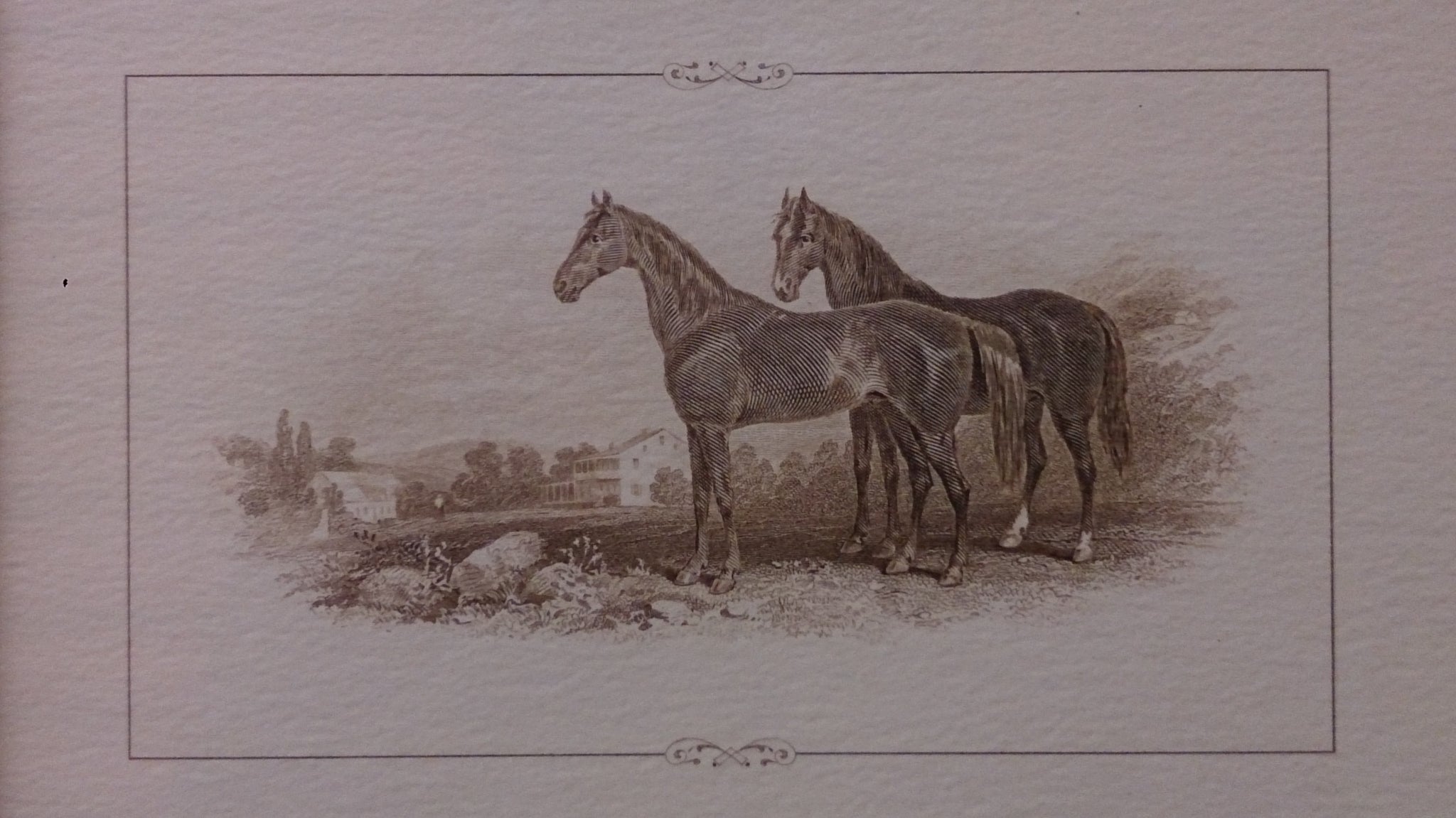 Étalon noir et jument, épreuve d'imprimeur gravée, encadré mat .