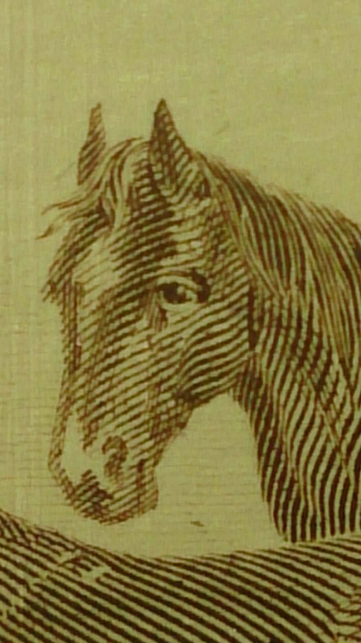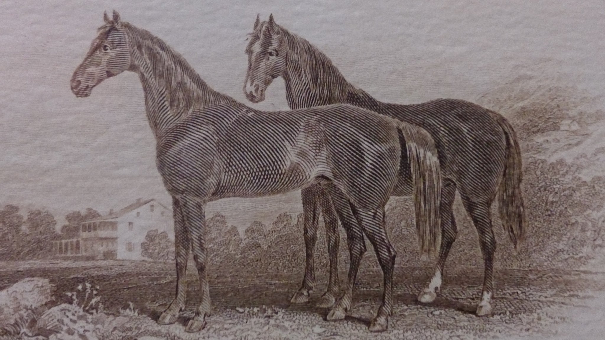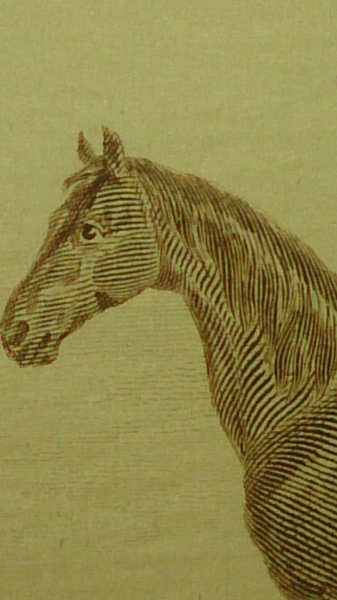 Étalon noir et jument, épreuve d'imprimeur gravée, encadré mat.