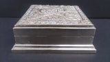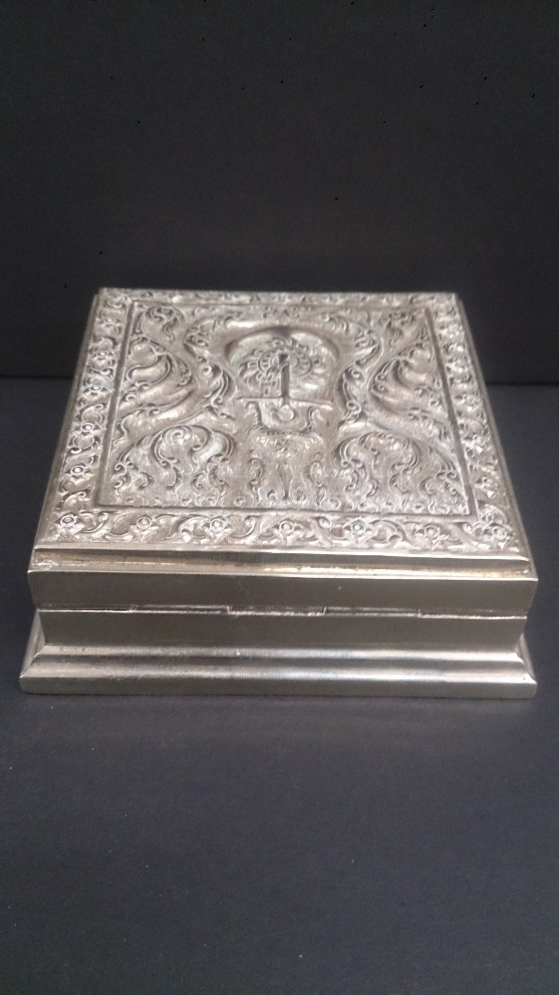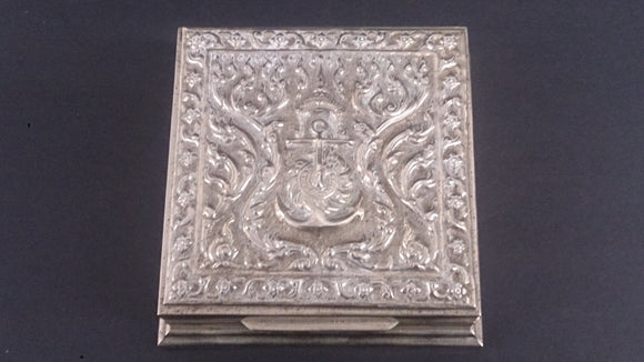 Coffret à bijoux, fabriqué en Thaïlande , cuivre blanc, cuivre magnifiquement martelé avec incrustation de bois, pièce centrale en forme d'ancre, entouré d'un motif floral finement détaillé.