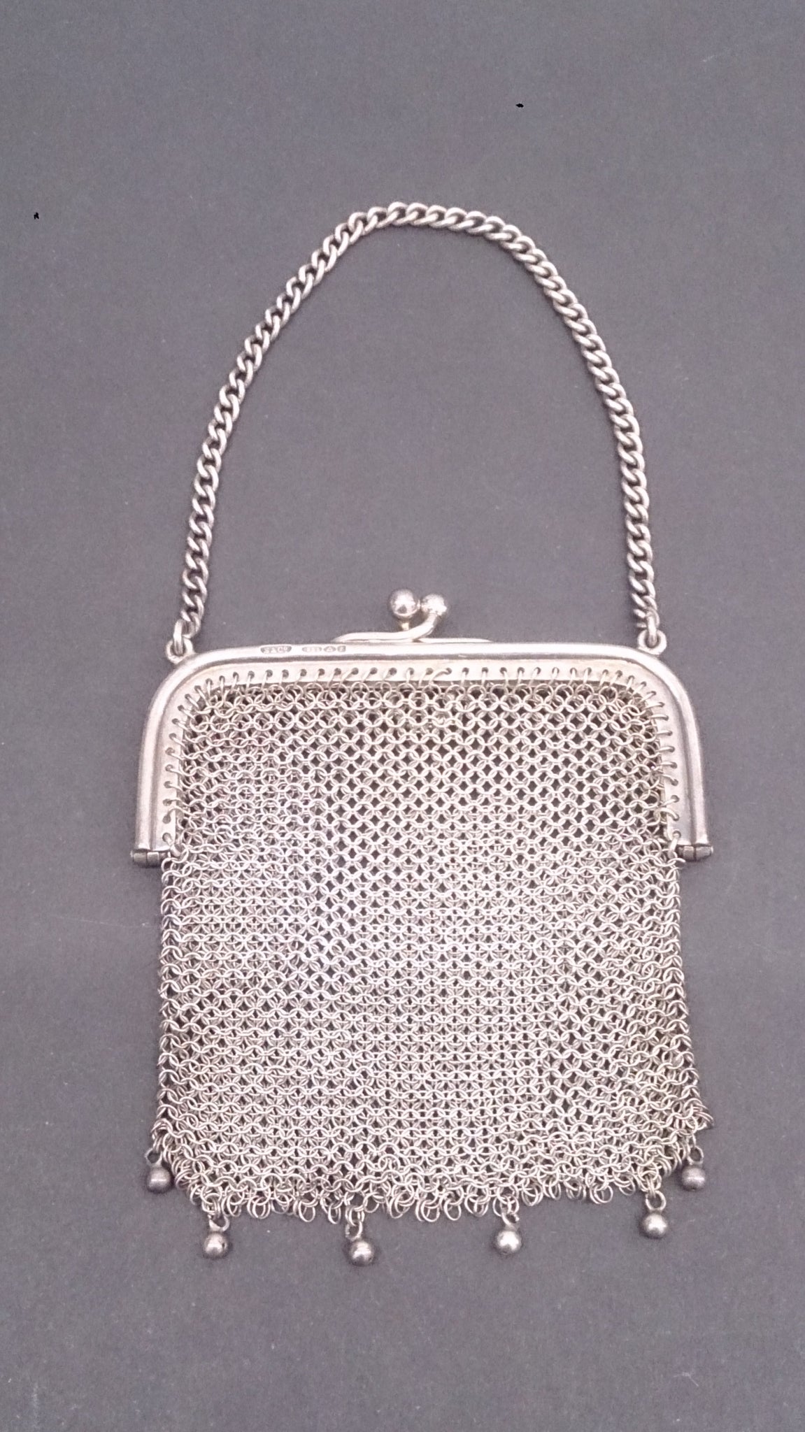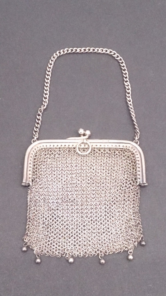 Art Nouveau Women's Sterling Silver Mesh Coin Purse, Hand Soldered, Bottom Hanging Six Balls, Stamped S & Co, Steinhart & Co - Seigfried Emil Steinhart, 14 Newhall Street, Birmingham, and 86 Oxford Street, London Birmingham 1905 Hallmark.