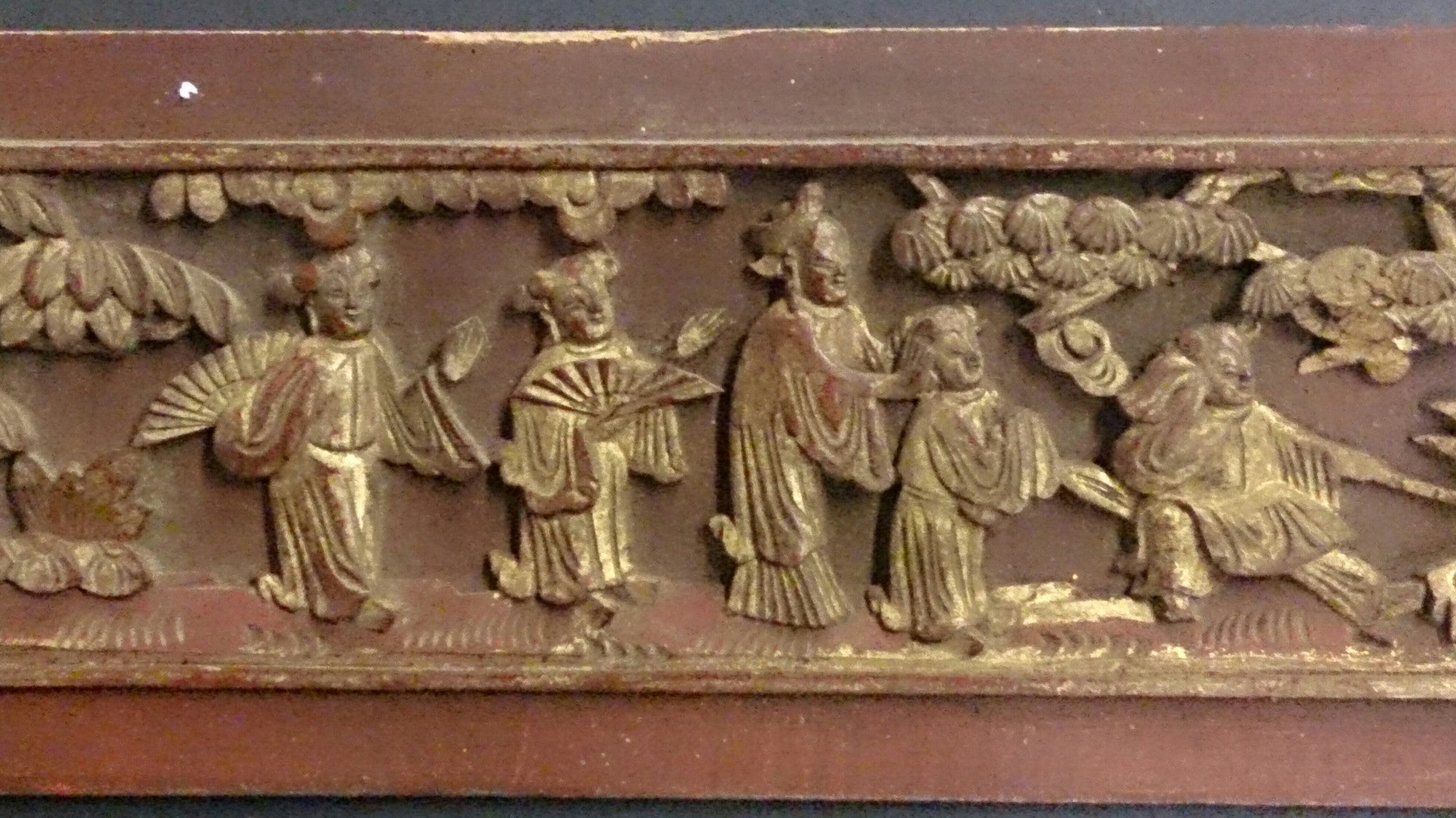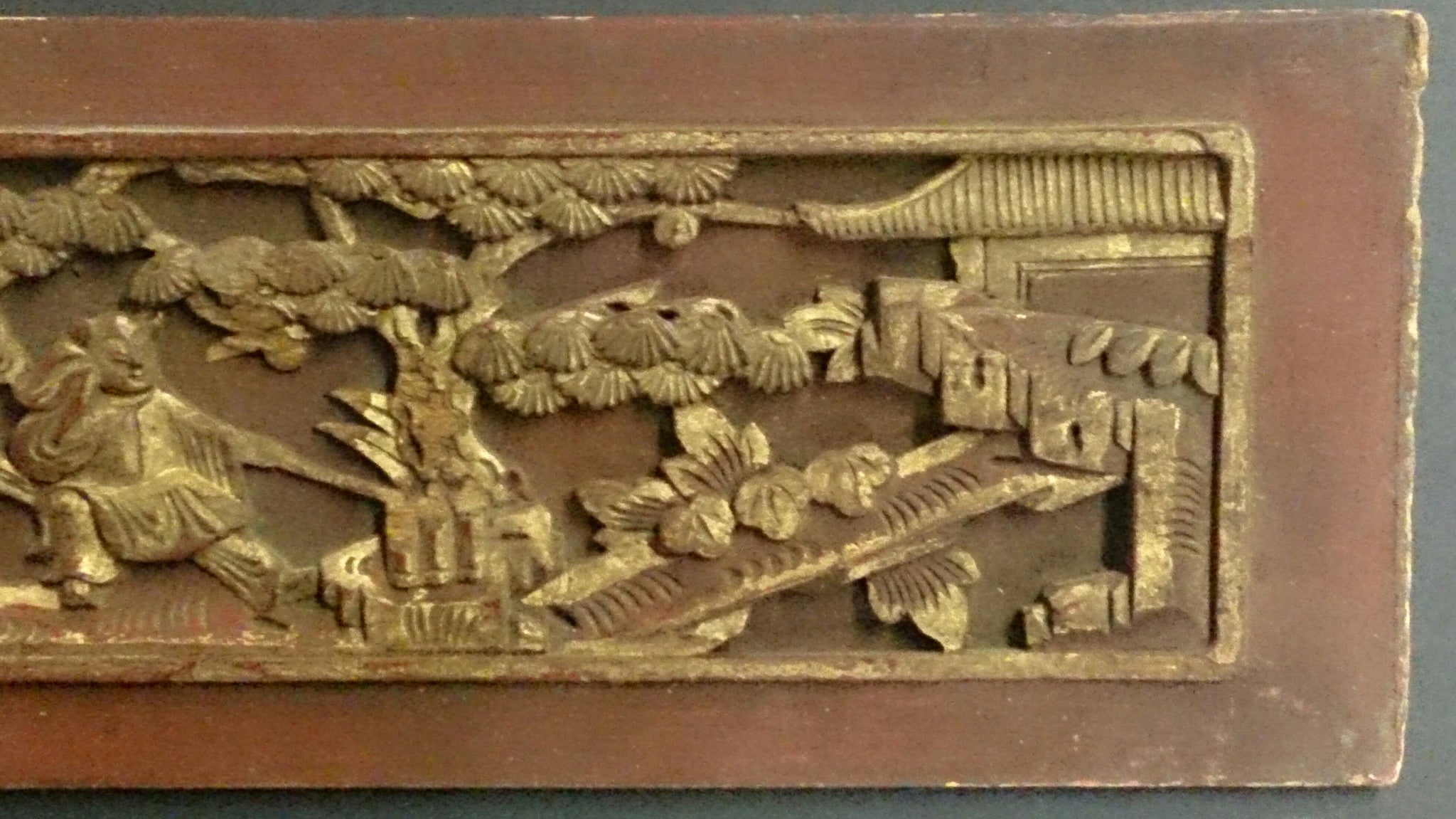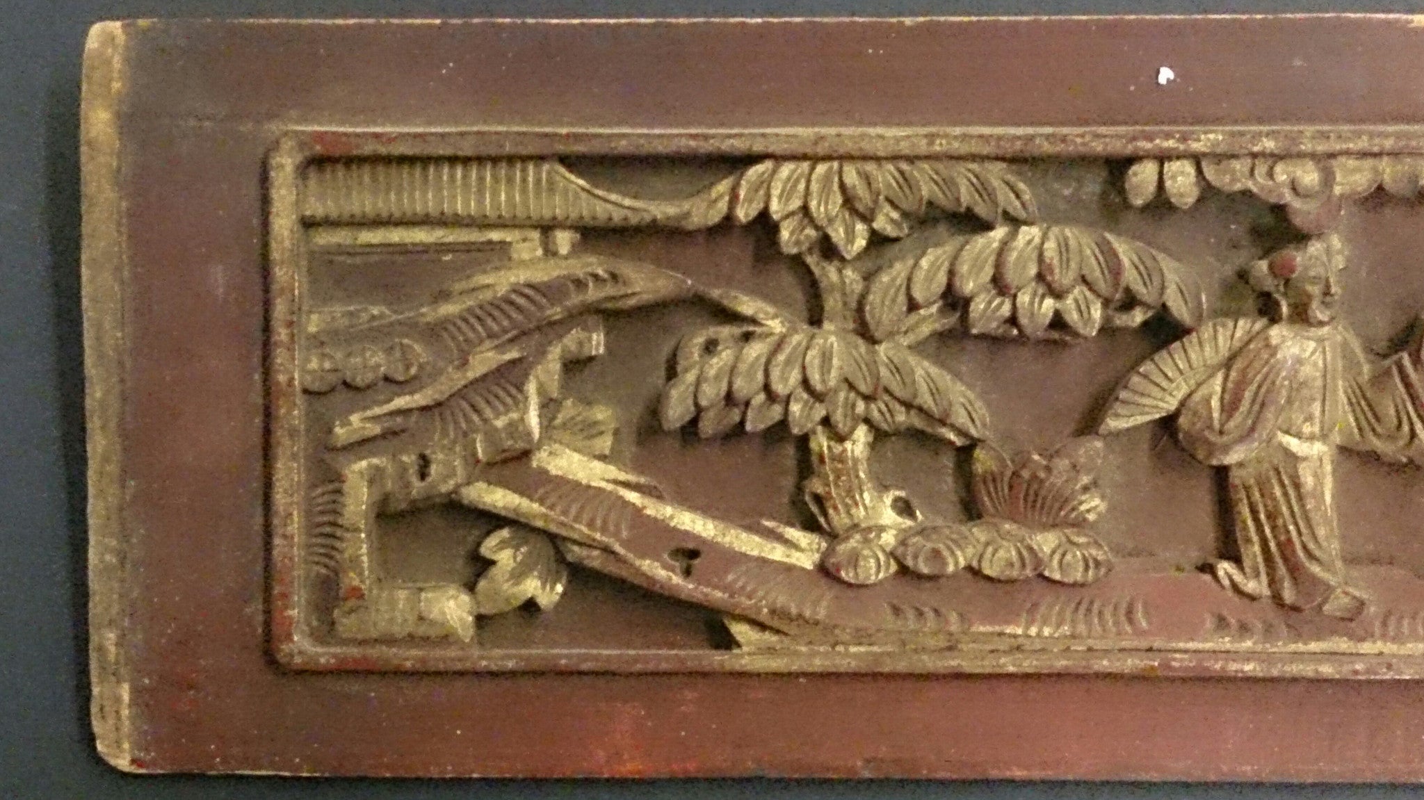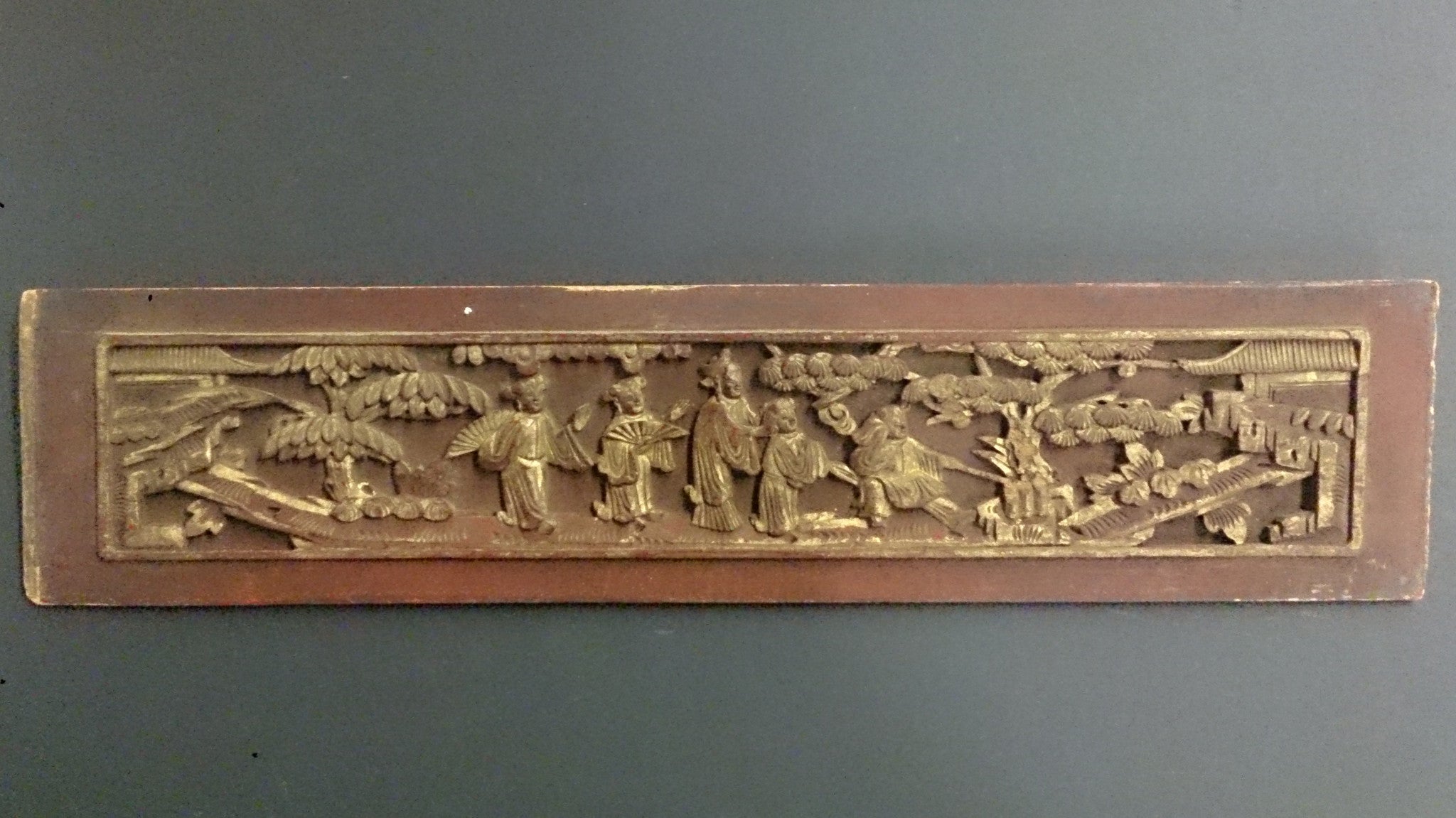 Chinese Relief Wall Panel, Hand Carved, Gold Gilded, Figures and Trees