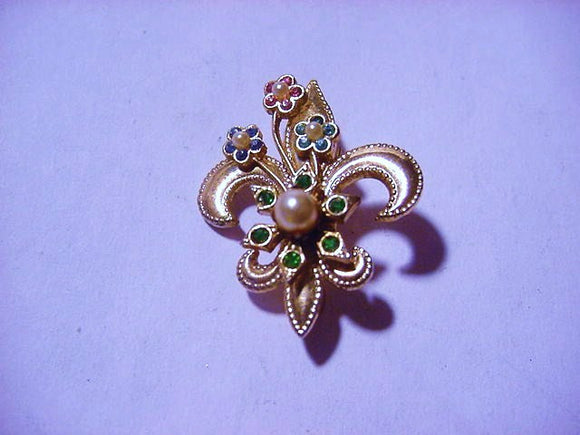 Flower Brooch, Fleur-de-lis Symbol, Green Blue Pink Stones, & Pearls.