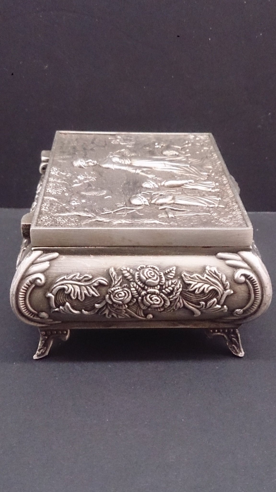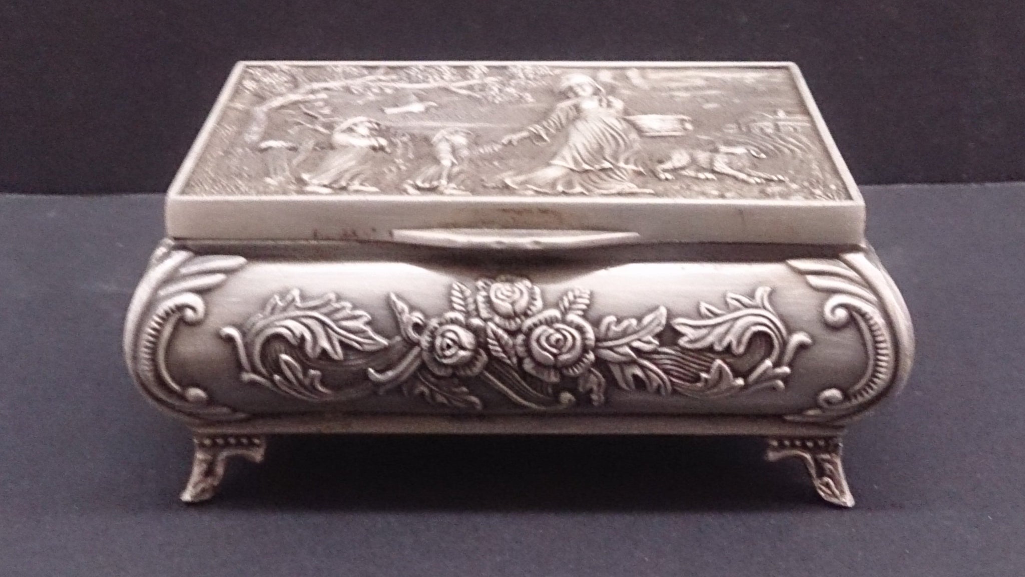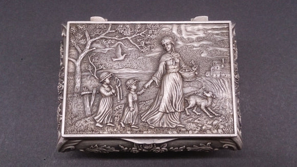 Jewellery Box, White Copper, Scene Of Mother, Children, Dog, and Dove.