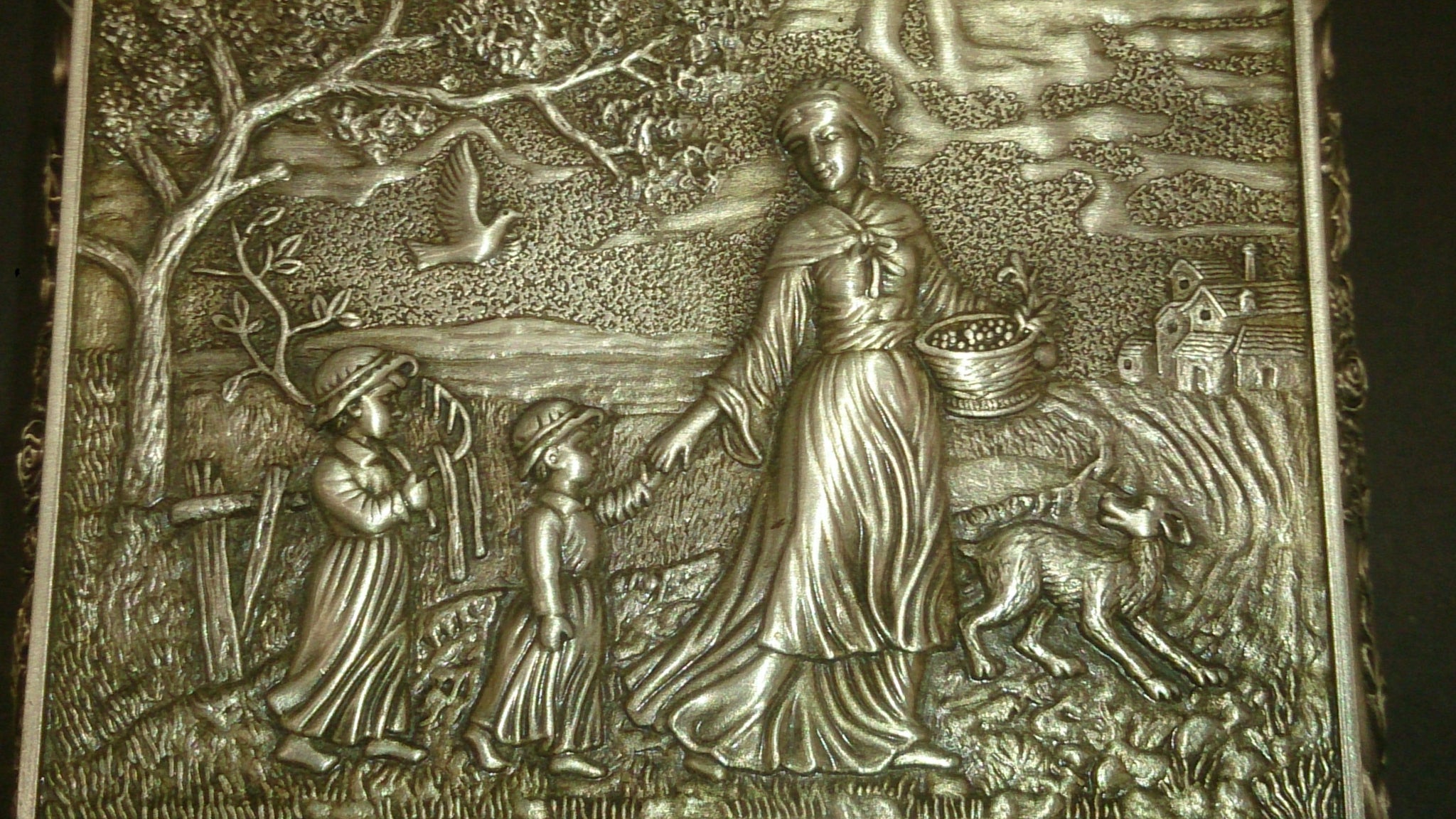 Jewellery Box, White Copper, Beautifully Hammered Copper, Scene Of a Mother and Her Children, Pet Dog, Walking Home After Picking Edible Sweet Acorns From a White Oak Tree, Dove Flying Above.