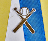 Images On Pin, Circulating Outside Of Pin, Stars, Center Top, Silhouette Of Two Bats Crossing, Above Both Bats a Baseball, Center Left Side, Blue Jays Logo, Center Right Side, World Series Logo, Below Center Reads, 1992 American League Champions, Bottom Of Pin, Attached are Two Ribbons, White and Blue, Placed On Top Of Both Ribbons Center, Two Bats Crossing, Above Both Bats a Baseball.