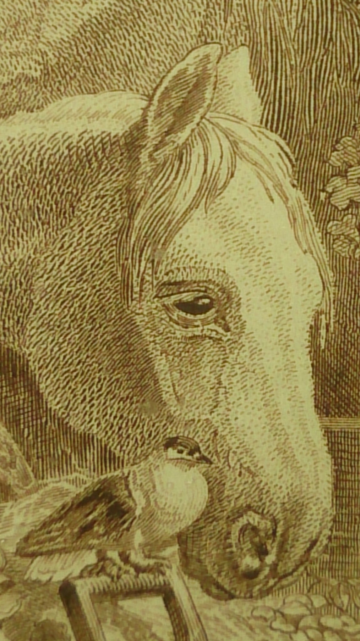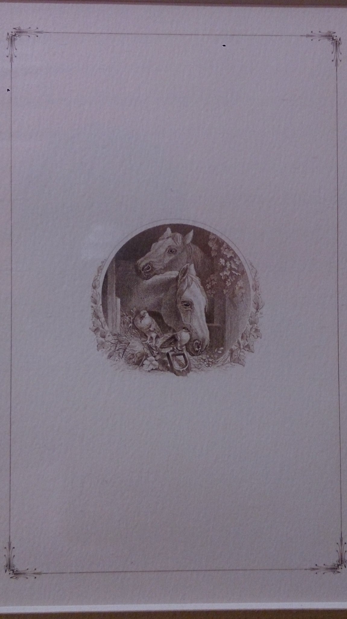Vintage Engraved Horse Print Two Horses & Pigeons in Wreath Frame