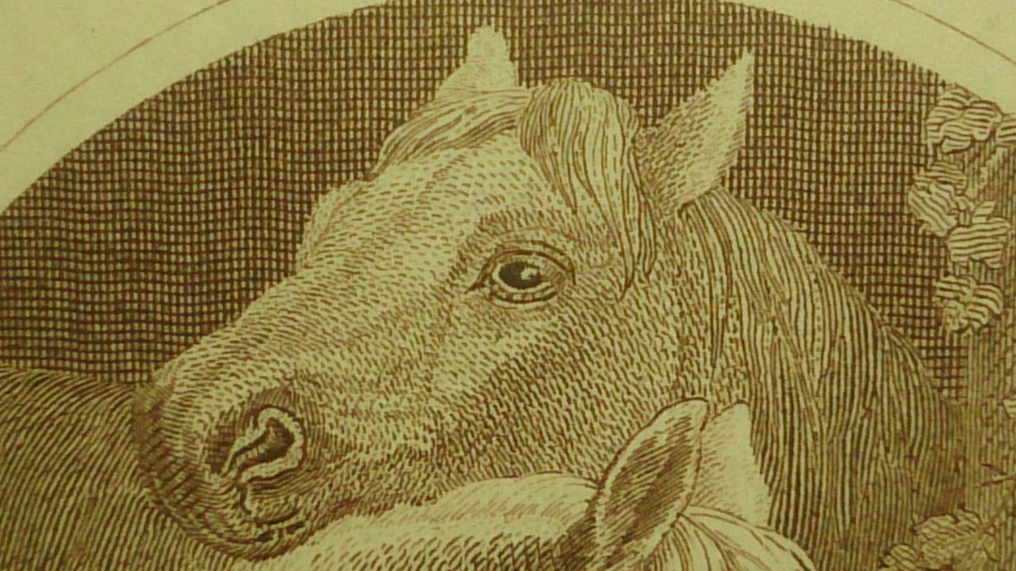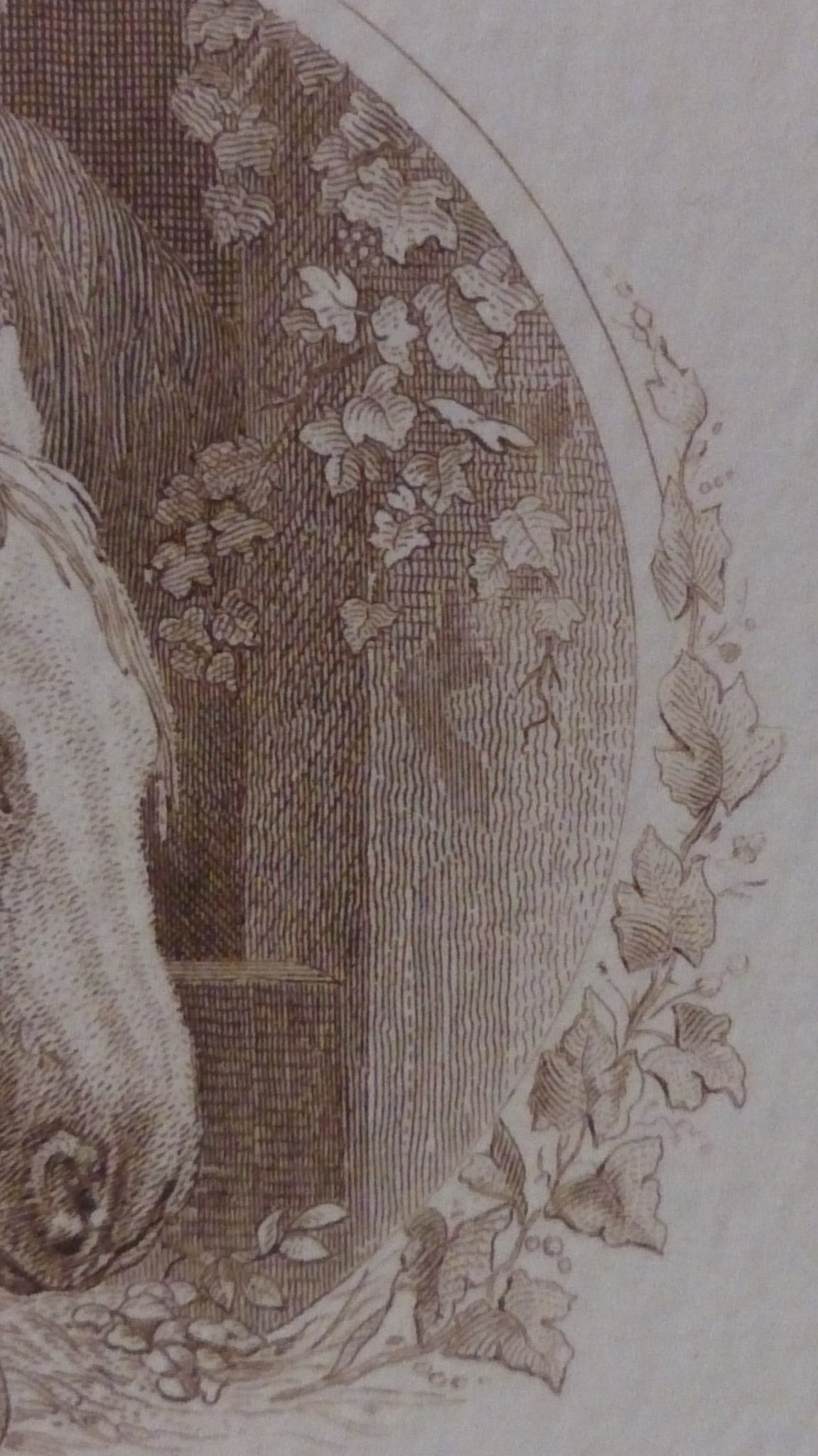 Vintage Engraved Horse Print Two Horses & Pigeons in Wreath Frame.